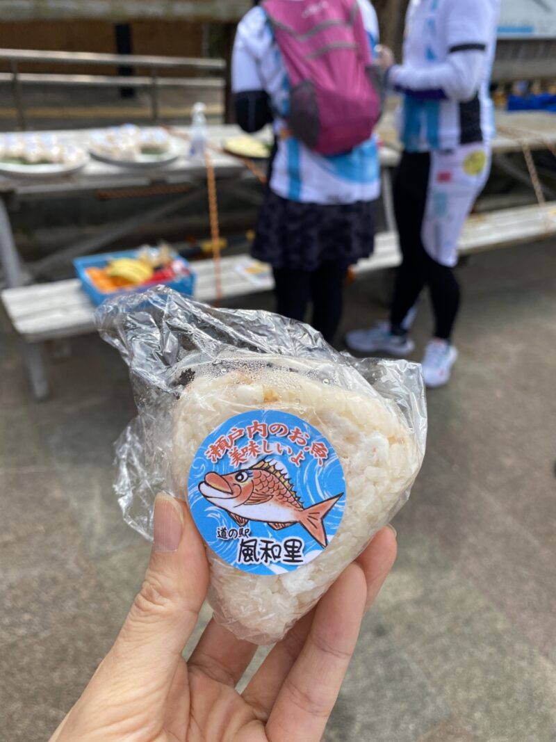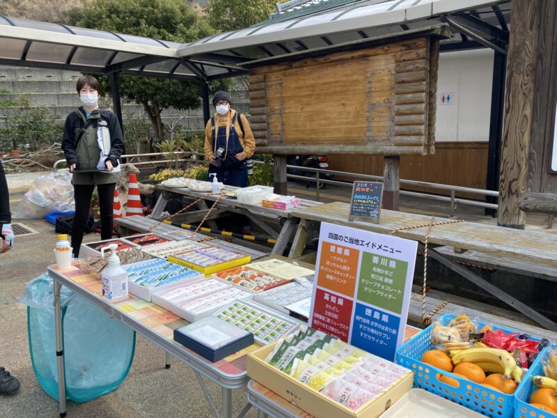 北条の道の駅「風和里(ふわり)」には、エイドステーションが設置されていて、四国各県の名産品がずらりと並んでいました。