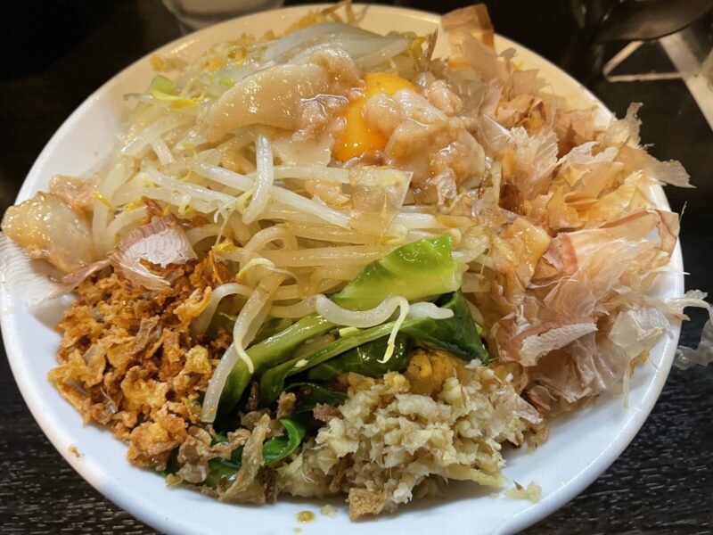周囲の人の食べ方をチラ見しながら、たっぷりの野菜に生卵、鰹節、ニンニクなどをこれでもか、と混ぜ混ぜしながらお箸を進める。