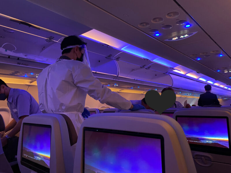 乗り込んだ機体の色に驚き、久々の機内食で排骨飯を選んでほっとひと息。