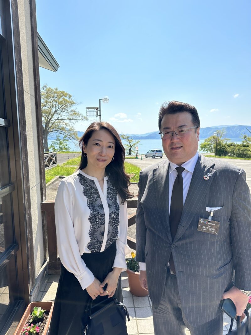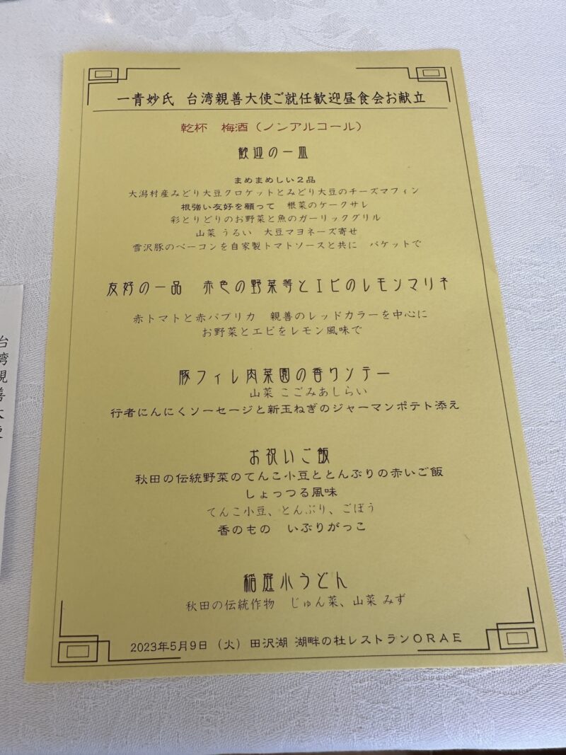 就任後は、仙北市国際交流協会主催の下、田沢湖の湖畔に建つ絶景のレストラン「湖畔の杜レストランORAE」で昼食会が開かれました。