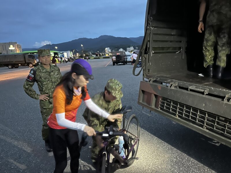 いろいろな要因が重なり、自転車は自衛隊の大きなトラックに積まれ、私自身は回収バスに乗り、輪島にゴールしました。