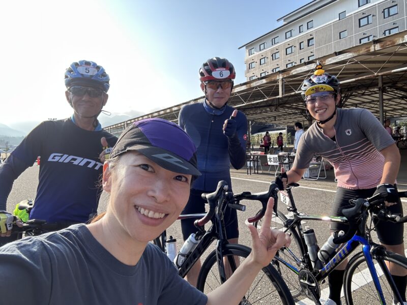 私は出走する人たちと記念撮影……って何かに気がつきませんか!?今日の私はサイクルジャージではなく、Tシャツ姿です。昨日のちょっとしたハプニングで、今日は早々に自転車を自衛隊のトラックに積み込み、荷物も預け、皆さんのお見送りをして、輪島&和倉観光に切り替えちゃいました。