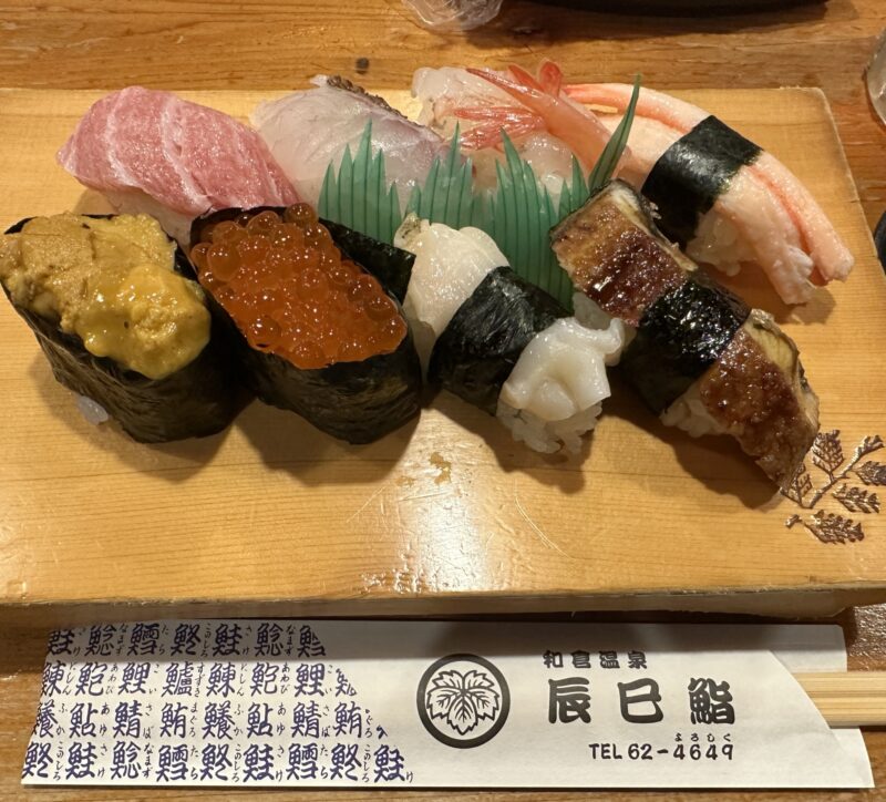 夕食は、昨年訪れてとっても美味しかった”辰巳寿司”を再訪し、バイ貝、カニ、タイなどなど、地元の味を堪能してきました。