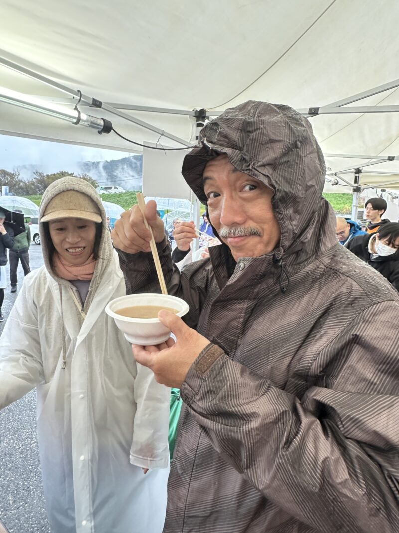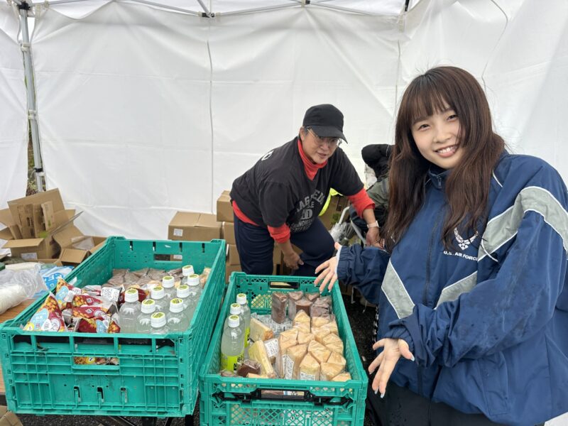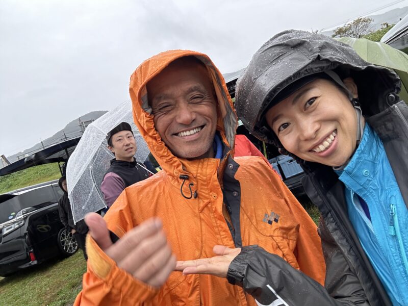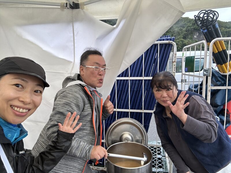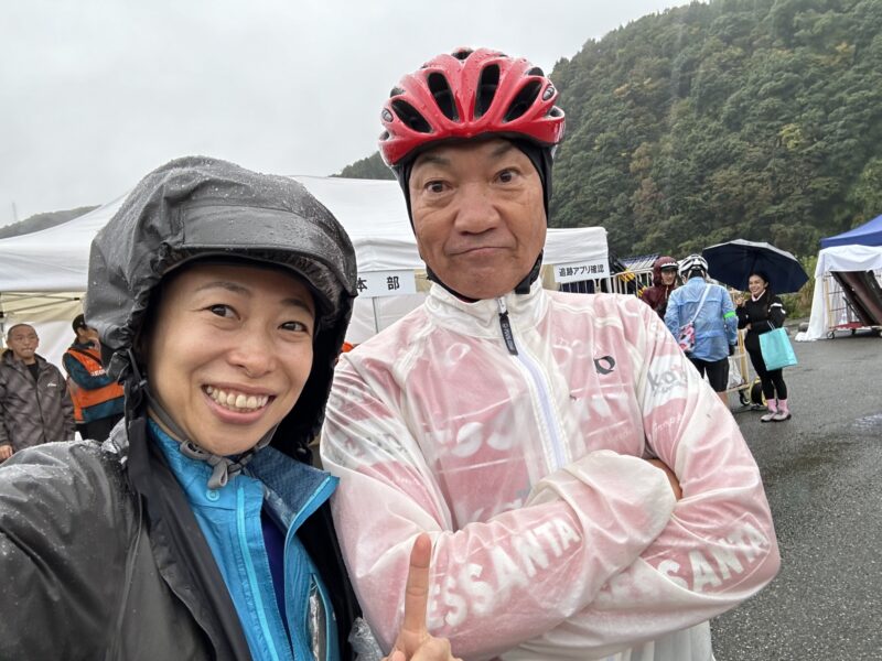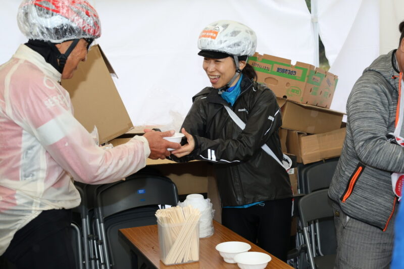 中止が決まったあとも、とってもかわいらしい大会ゲストの”愛 あむさん”と”あっちゃん”さん、日本語の先生・yukaさんと一緒に、参加予定者の皆さんと記念写真をとったり、エイドステーションで配布予定のおにぎりやシフォンケーキ、豚汁などを配ったりして、白山での自転車交流を楽しみました。