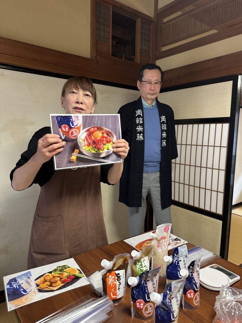 代々この地で醸造業を営んできた一族の安藤社長は、発酵食文化だけでなく、角館の歴史も絡めながら話をしてくださり、勉強になりました。麹を使った卵焼きや豆腐の試食の他、麹を使って実際に野菜の漬物を作る実習もできるので、見て聞いて作ってと、充実した体験でした。