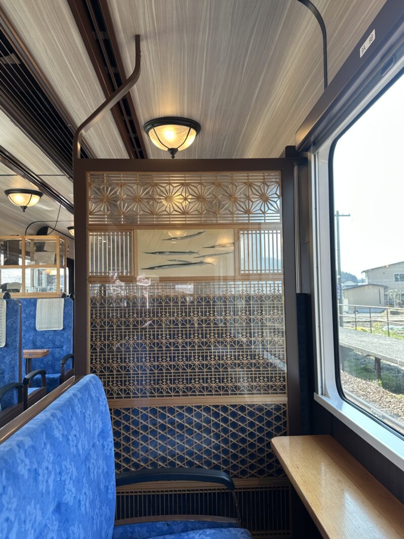 使用する車両は、シートが茶色の「里山号」とシートが青色の「海山号」。車内には、輪島塗や和ろうそく、能登上布、珠洲焼など、能登の伝統工芸品が展示されています。特に、座席間のパーテーションに、くぎを一本も使わずに細かい木を組み合わせる精巧な組子細工「田鶴浜建具」を使っており、とても美しく見応えがあり、まるで動く能登美術館のようでした。