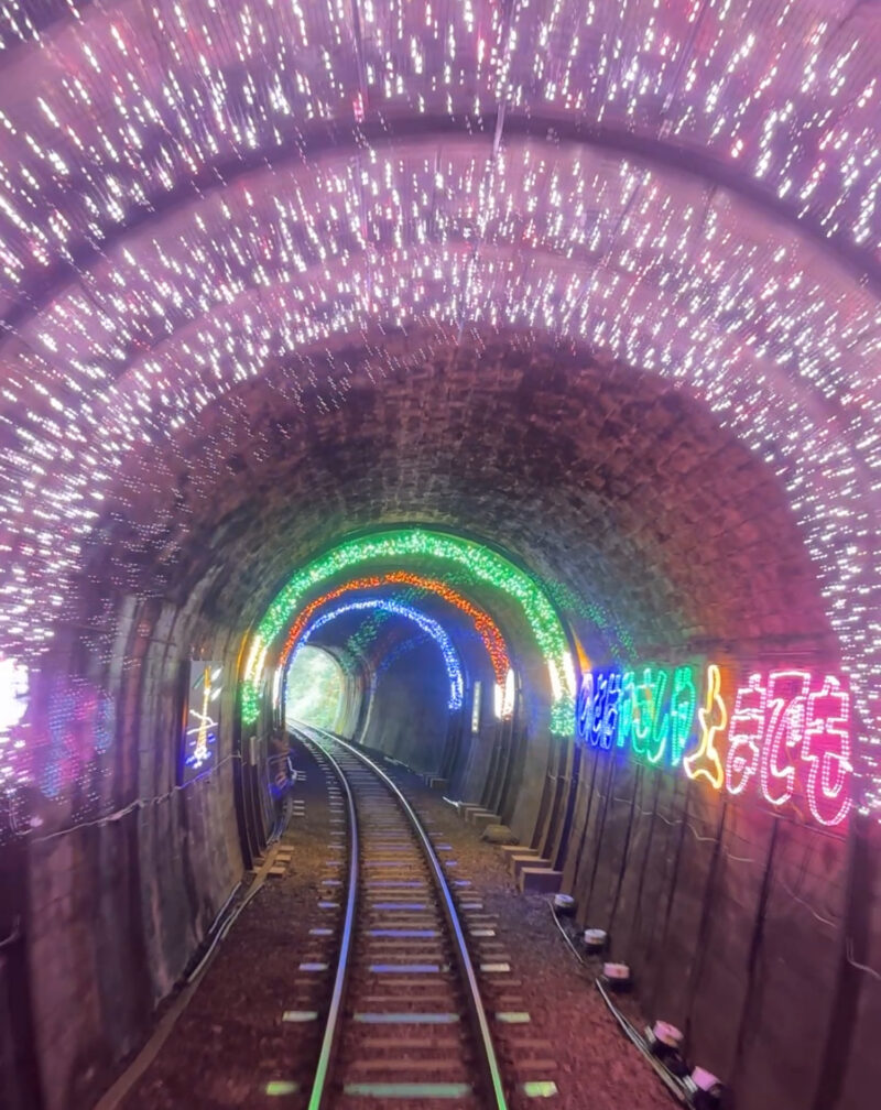 穴水駅近くの乙ヶ崎隧道内は”トンネルイルミネーション”が施されています。これは、沿線に工場が立地する村田製作所の協力で設置できたとのこと。「のとはやさしやつちまでも」の文字と共に、語り部の方々が願ったトキが羽ばたく姿が浮かび上がっていました。能登弁で「ほんならね、また来てくだいね、まっとんね」と語り部が乗客に向けて最後の挨拶をして、旅は終わります。