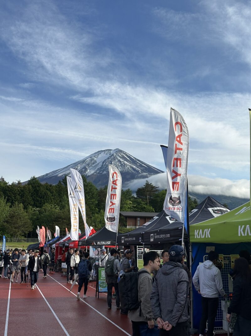 ずっと登りは辛いけれども、富士山の山頂が顔をのぞかせる中、真剣にタイムを狙っている人たちはトレインを作って声をかけながら颯爽と登っていきます。