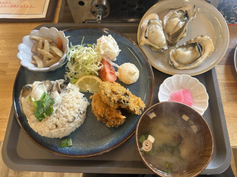 注文したのは牡蠣ランチプレート(蒸し牡蠣3個、牡蠣フライ3個、カキごはん、小鉢、味噌汁)と焼き牡蠣 。