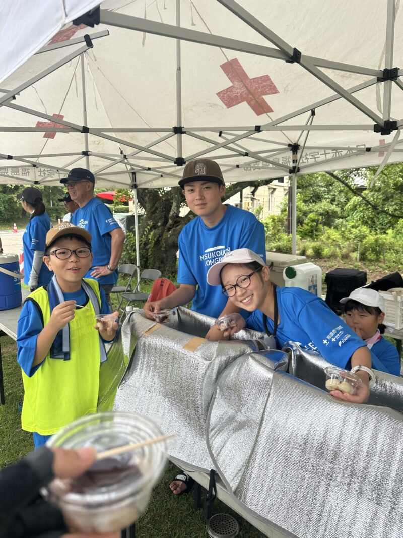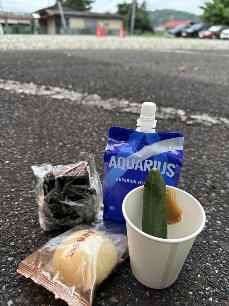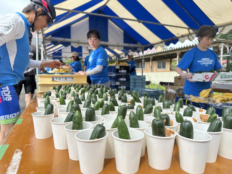 スタートしてから10kmほどで到着した第一エイドでは、早速那須高原ロングライドの名物”うなぎり”(味付きごはんに小さくカットしたうなぎを混ぜ、おにぎりにしたもの)やバナナ、御用邸の月(カステラでカスタードクリームを包んだもの)、味噌添えのきゅうりの提供があって、みんな「豪華な朝食!」「こんなに食べきれない〜」と笑顔になります。