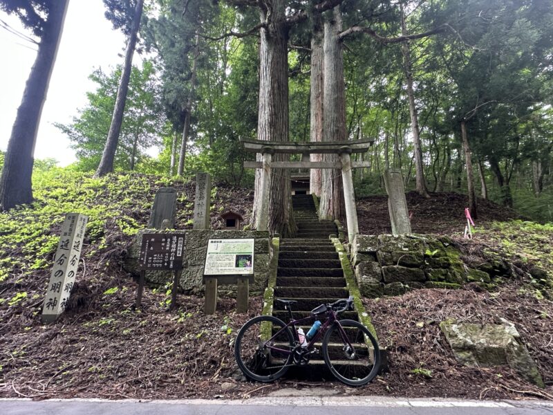 お腹いっぱい状態でこのコースのハイライトとなる栃木県と福島県の県境の峠を登っていくと、義経伝説が残る”追分の明神”が現れ、下った先に福島県の白河の関跡が”白河そば”を食べられる第二エイドとなります。