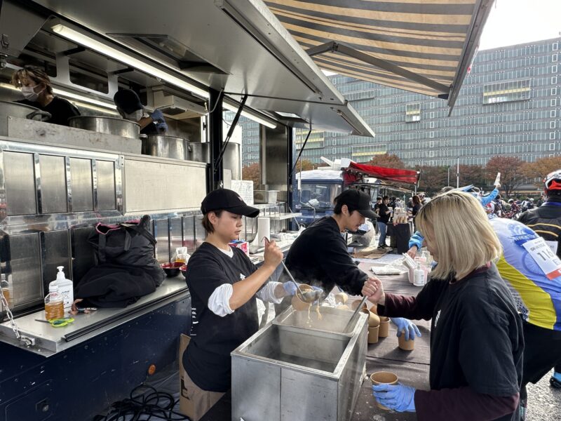 ゴール後は、豚汁や中華スープ、トマトスープが振る舞われ、イベント会場ではトークショーとキッズスクールがあり、パラサイクル体験をしてきました。