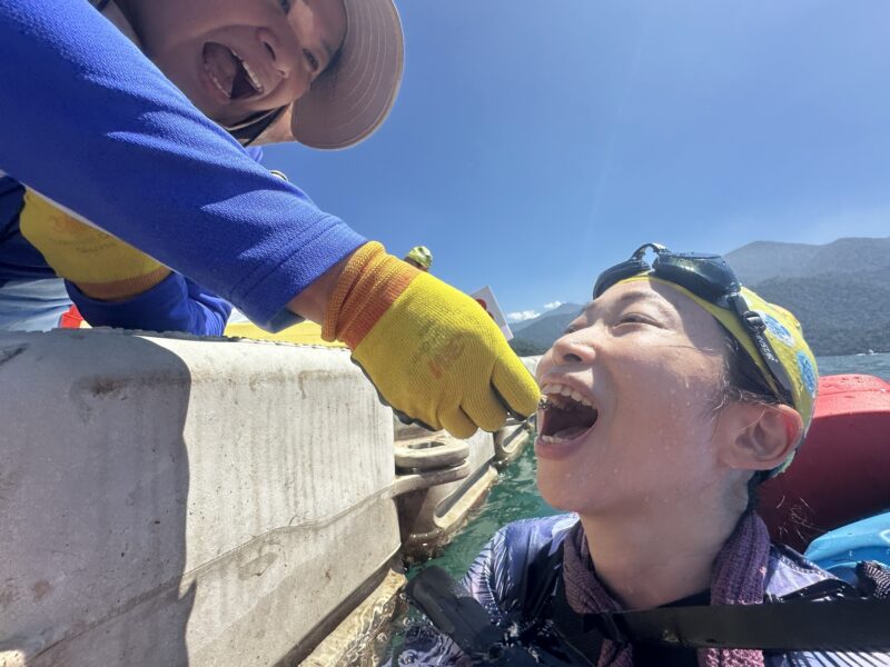 ブイにたどりついて水の中から口をぱくぱくさせていると、『飲みたい?ほれ!(想喝嗎?來~!)』『食べたい?ほれ!(想吃嗎?來~!)』と、口のなかに放り込んでくれます。