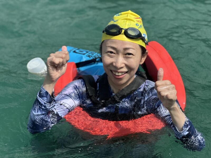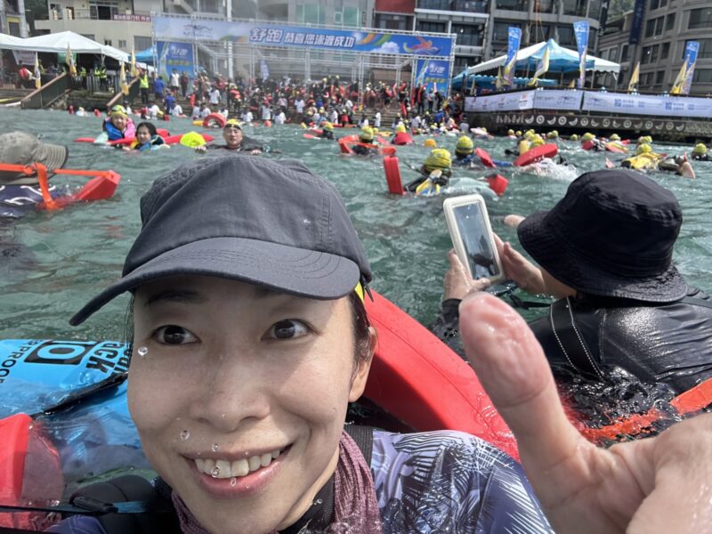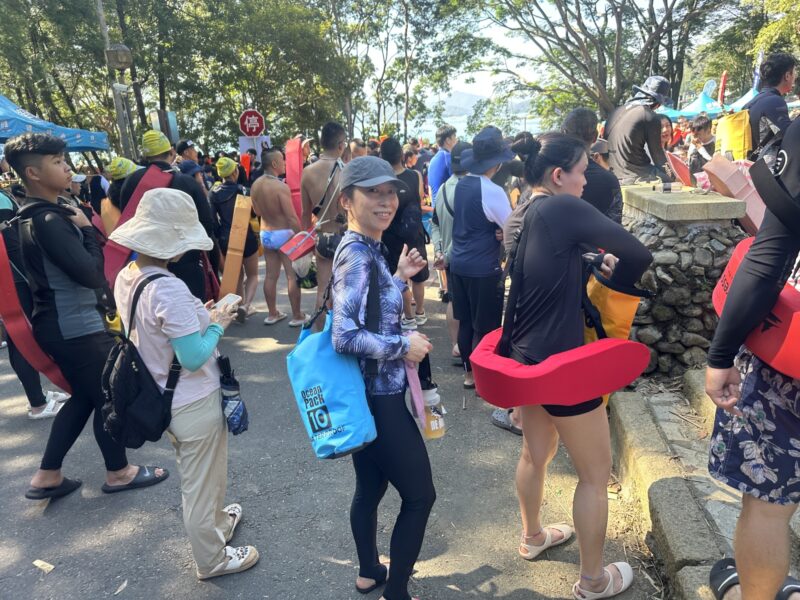 他にもシュノーケルをつけて泳ぐ人、バックで泳ぎ続ける人、お父さんの背中に乗りながら泳ぐ子供、缶ジュース片手に泳ぐ人、撮影しながら泳ぐ人など、参加者の年齢も泳ぐスタイルも幅広く、「疲れた〜!(我累了~!)」と言いながらも、心から楽しんでいる姿を随所で見かけ、気がつけば、ゴールゲートを前に、私も携帯で自撮りをしながら、「やったー!!!」と声をあげていました。